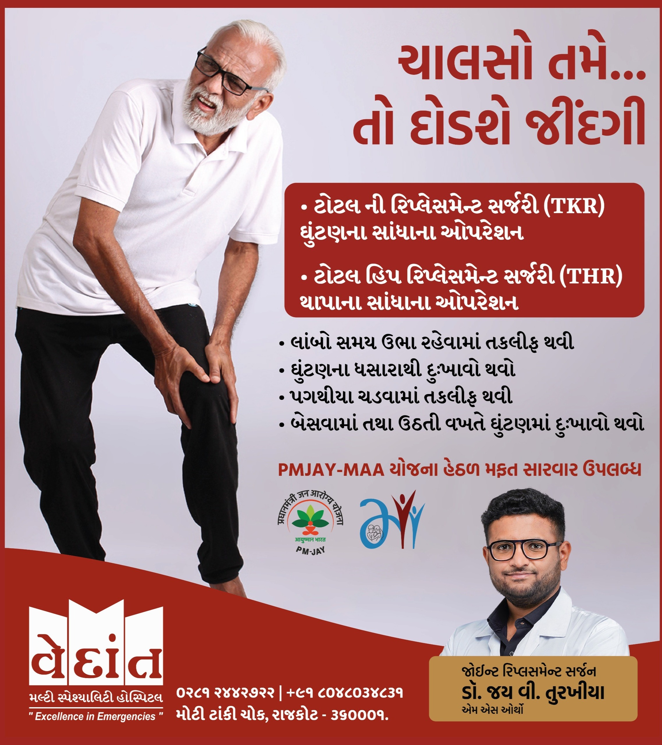 Get in touch with Vedant Hospital Rajkot 24/7 Emergency for knee joint replacement in MAA Card in Rajkot.